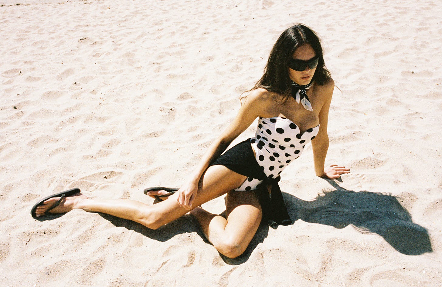 Twyla top in white & black polka dot, matching head scarf, matching mini skirt, matching ruffle bottom